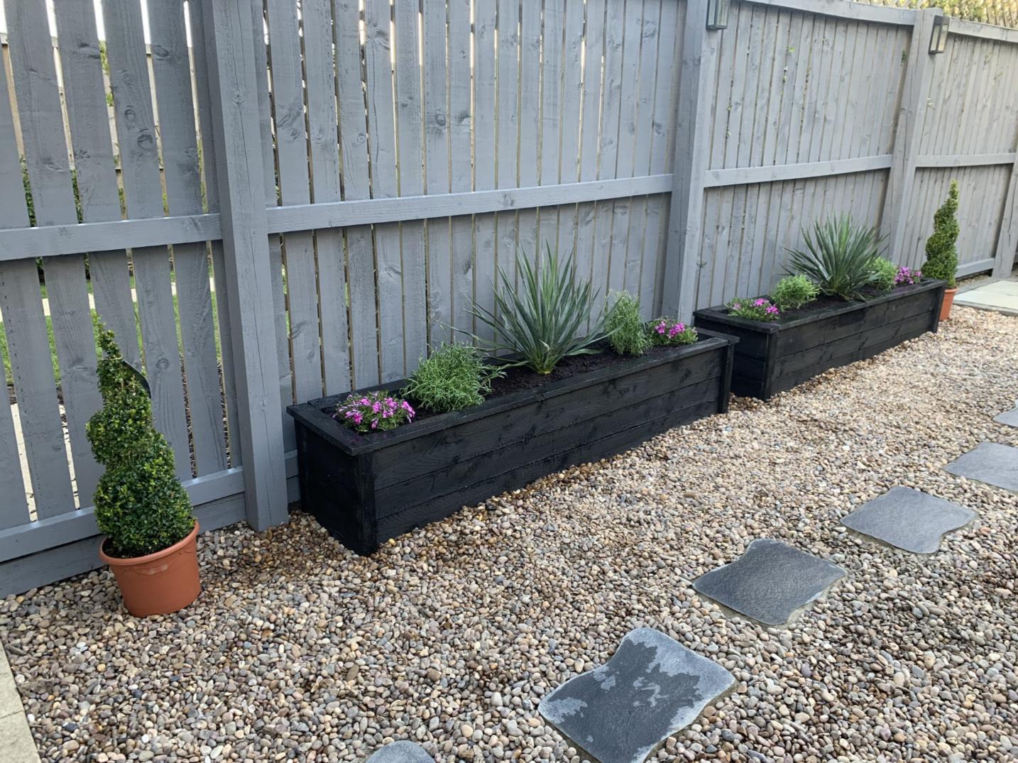 As with many new build properties, the drainage at this site is fairly poor and the lawn became waterlogged during rainy periods which was frustrating for the owners. Therefore after a couple of years they made the decision to replace the lawn with decorative aggregate which provides a solution to the drainage problem and also looks great! The fence was painted grey to match the colour scheme and some random paving stones laid to provide a path across the garden to the rear patio. Here are a few pictures of the second transformation and how the garden looks now.
