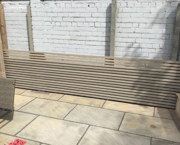 Scandinavian style battens were used to create a contemporary slatted fence. These redwood battens were painted grey to match the patio and the effect the couple wished to achieve in their garden