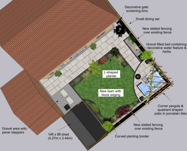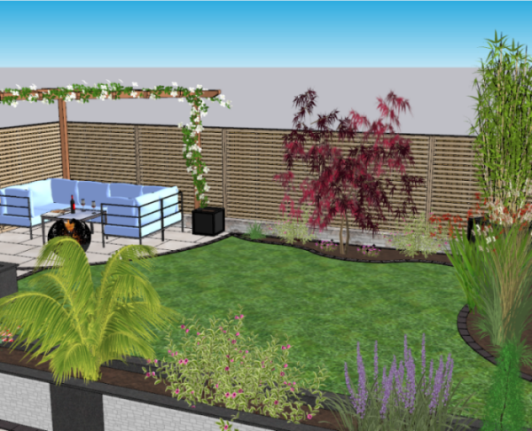 Once all the hard landscaping was complete, the garden was turfed and the installation of the water feature and the planting was completed by the customer according to the plan we agreed during the design process. What a transformation from that muddy patch of earth a few months previous!