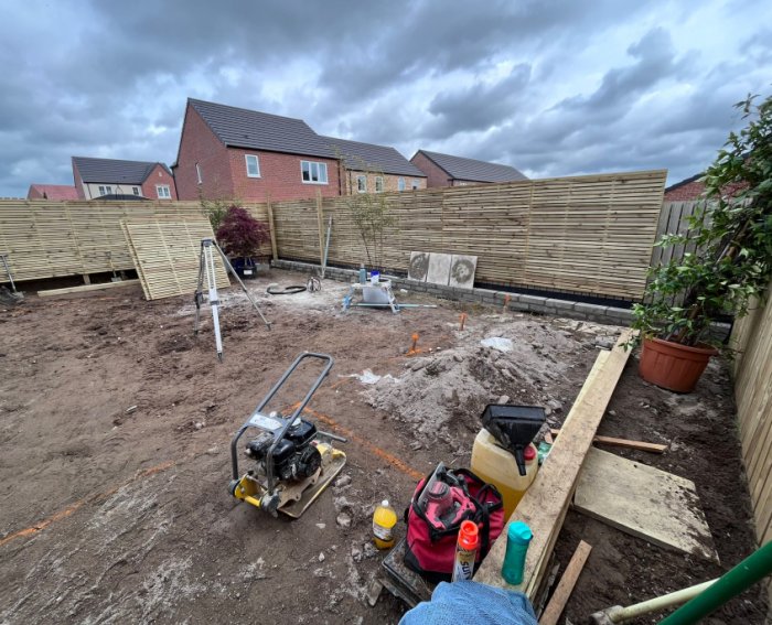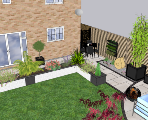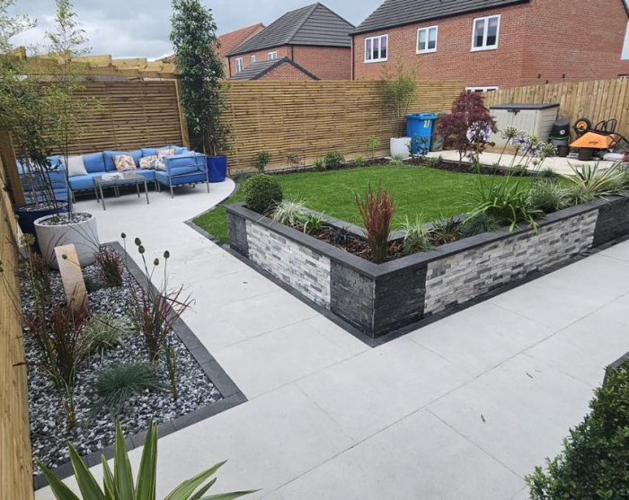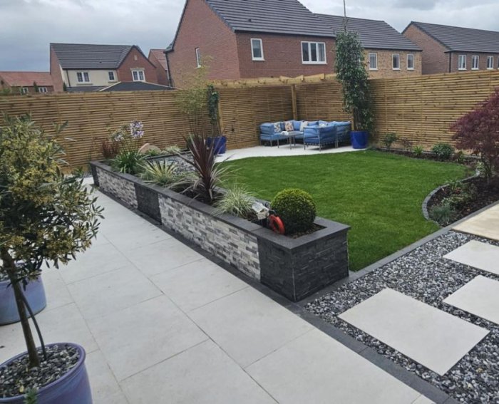 I was contacted by a customer who had moved into a newly built home on the outskirts of Driffield. The rear garden space was quite large but basically just a patch of earth with a downwards slope to the rear. The customer wanted to have a contemporary style garden with patios, a lawned area a feature raised planter and other planting spaces. The space was surrounded on three sides with basic fencing which would also be replaced with a modern horizontal slatted finish.