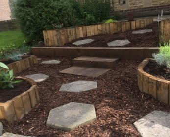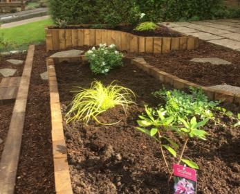 Once completed I was able to line the beds with a membrane to protect the wood and fill with topsoil, compost and conditioner. I was also able to lay a weed membrane throughout the rest of the garden and lay fresh bark chippings and the stepping stone path. Additional stepping stones were placed to enable the customer to access the beds to tend the planting when necessary.