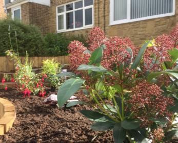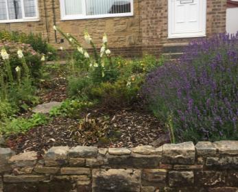 I was asked to redesign this small sloping front garden in Bradford. The customer wanted an easily maintained accessible space ideally on two levels with some raised beds and colourful low maintenance planting. Initially the garden was full of self seeded foxgloves, a few overgrown shrubs and a very well established large lavender plant. It had some old bark chippings laid on top of landscape fabric that needed replacing.